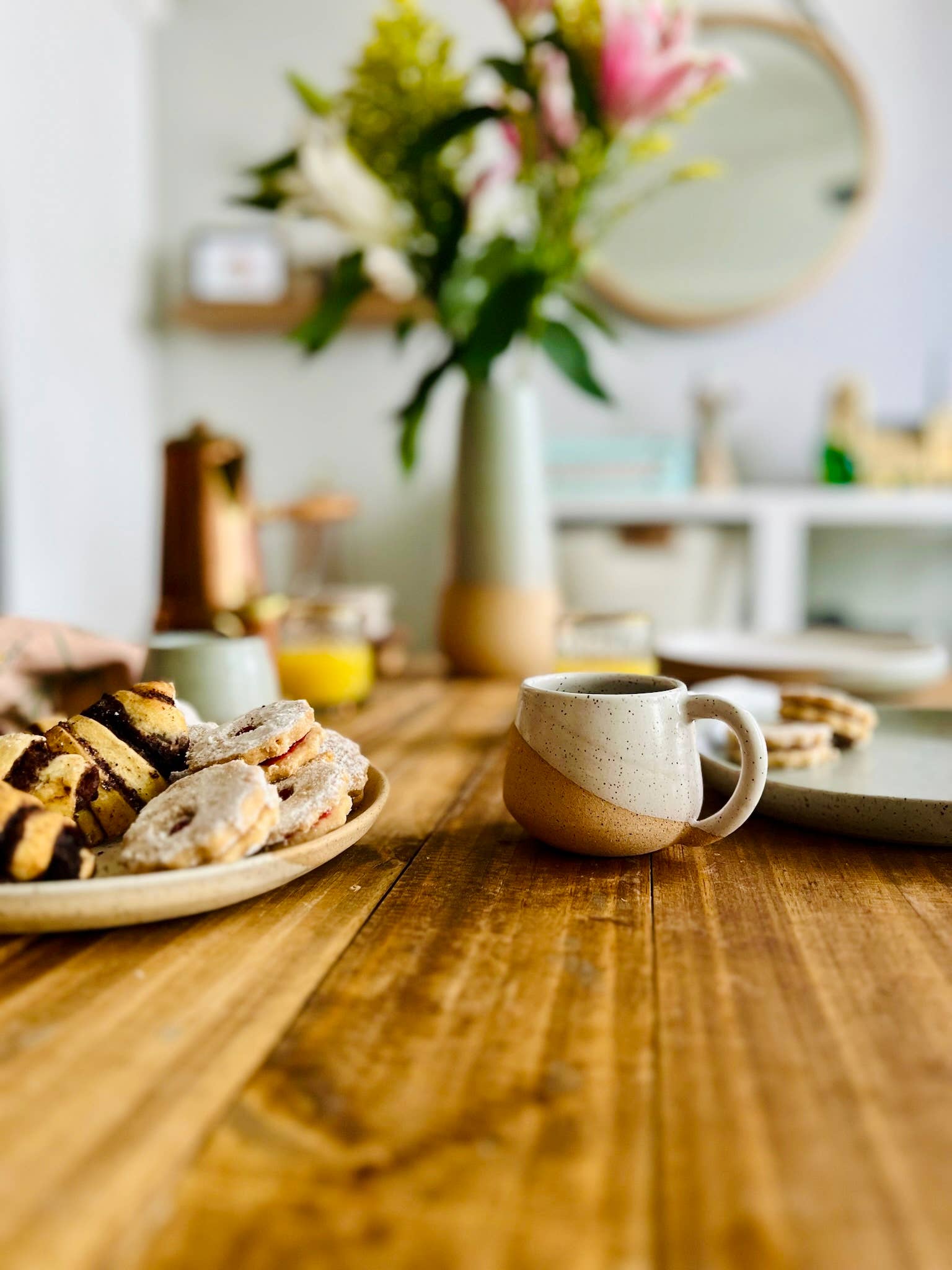 These modern espresso mugs were thrown on the potter's wheel using stoneware clay, and cross-dipped in warm glaze.