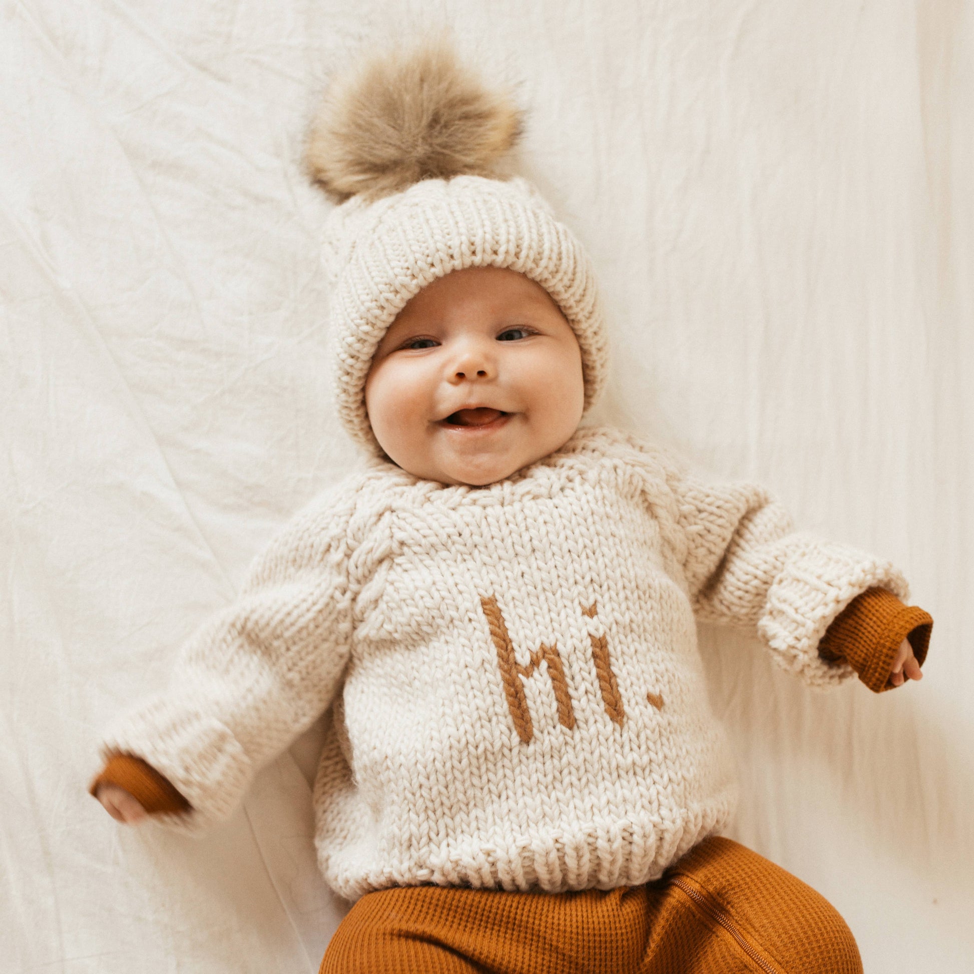 Say hello to cozy comfort with our hi. pullover sweater, crafted from natural-toned yarn. Featuring charming cable-trim raglan sleeves and the word hi. knitted in pecan brown on the front, this sweater is as playful as it is warm. The soft, stretchy neck makes dressing little ones a breeze. Hand-knit with chunky yarn, it’s a snug, gender-neutral choice for any little adventurer.